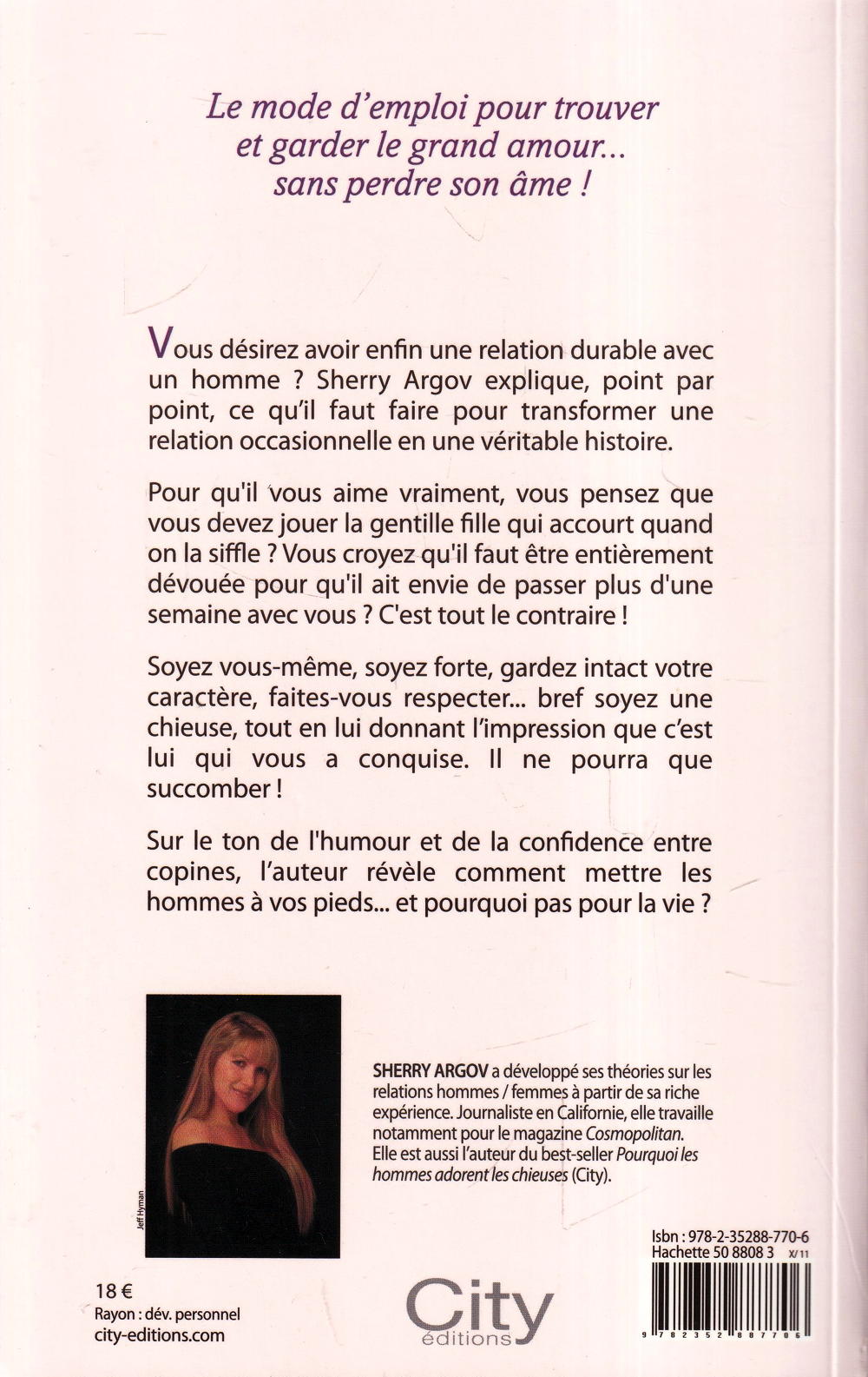 Vous désirez avoir enfin une relation durable avec un homme ? Sherry Argov explique, point par point, ce qu'il faut faire pour transformer une relation occasionnelle en une véritable histoire. Pour qu'il vous aime vraiment, vous pensez que vous devez jouer la gentille fille qui accourt quand on la siffle ? Vous croyez qu'il faut être entièrement dévouée pour qu'il ait envie de passer plus d'une semaine avec vous ? C'est tout le contraire ! Soyez vous-même, soyez forte, gardez intact votre caractère, faites-vous respecter...bref soyez une chieuse, tout en lui donnant l'impression que c'est lui qui vous a conquise. Il ne pourra que succomber ! Sur le ton de l'humour et de la confidence entre copines, l'auteur révèle comment mettre les hommes à vos pieds...et pourquoi pas pour la vie ?