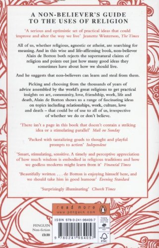 The boring debate between fundamentalist believers and non-believers is finally moved on by Alain de Botton's inspiring new book, which boldly argues that the supernatural claims of religion are of course entirely false - and yet that religions still have important things to teach the secular world. Rather than mocking religions, agnostics and atheists should instead steal from them - because they're packed with good ideas on how we live and arrange our societies. Blending deep respect with total impiety, de Botton (a non-believer) proposes that we should look to religions for insights into how to build a sense of community, make our relationships last, get more out of art, overcome feelings of envy and inadequacy, and much more. For too long non-believers have faced a stark choice between either swallowing peculiar doctrines or doing away with consoling and beautiful rituals and ideas. At last Alain de Botton has fashioned a far more interesting and truly helpful alternative.