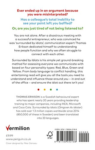 Originally published in Swedish in 2014 as Omgiven Av Idioter, Erikson's Surrounded by Idiots is already an international phenomenon, selling over 1.5 million copies worldwide, of which over 750,000 copies have been sold in Sweden alone. It offers a simple, yet ground-breaking method for assessing the personalities of people we communicate with - in and out of the office - based on four personality types (Red, Blue, Green and Yellow), and provides insights into how we can adjust the way(s) we speak and share information.