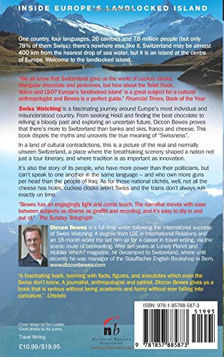 One country, four languages, 26 cantons, and 7.5 million people (but only 80% of them Swiss): there's nowhere else in Europe like it. Switzerland may be almost 400 km from the nearest drop of seawater, but it is an island at the centre of Europe. Welcome to the landlocked island. Swiss Watching is a fascinating journey around Europe's most individual and misunderstood country. From seeking Heidi and finding the best chocolate to reliving a bloody past and exploring an uncertain future, Diccon Bewes proves that there's more to Switzerland than banks and skis, francs and cheese. This book dispels the myths and unravels the true meaning of Swissness. In a land of cultural contradictions, this is a picture of the real and normally unseen Switzerland, a place where the breathtaking scenery shaped a nation not just a tour itinerary, and where tradition is as important as innovation. It's also the story of its people, who have more power than their politicians, but can't speak to one another in the same language and who own more guns per head than the people of Iraq. As for those national cliches, well, not all the cheese has holes, cuckoo clocks aren't Swiss and the trains don't always run exactly on time.