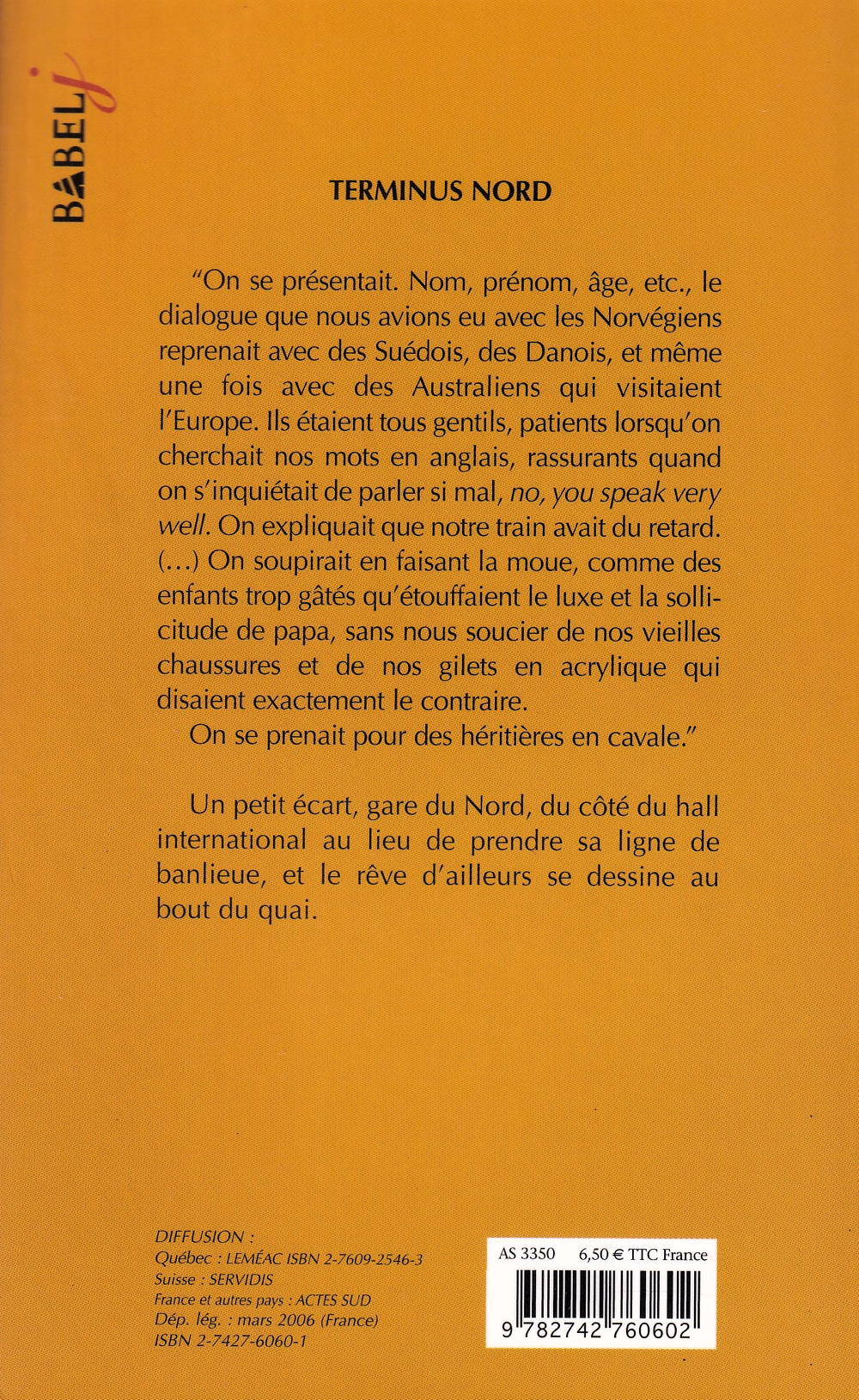 (...) On soupirait en faisant la moue, comme des enfants trop gâtés qu'étouffaient le luxe et la sollicitude de papa, sans nous soucier de nos vieilles chaussures et de nos gilets en acrylique qui disaient exactement le contraire. On se prenait pour des héritières en cavale.