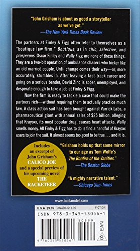 The partners at Finley & Figg often refer to themselves as a “boutique law firm.” Boutique, as in chic, selective, and prosperous . Oscar Finley and Wally Figg are none of these things. They are a two-bit operation of ambulance chasers who bicker like an old married couple. Until change comes their way--or, more accurately, stumbles in. After leaving a fast-track career and going on a serious bender, David Zinc is sober, unemployed, and desperate enough to take a job at Finley & Figg. Now the firm is ready to tackle a case that could make the partners rich--without requiring them to actually practice much law. A class action suit has been brought against Varrick Labs, a pharmaceutical giant with annual sales of $25 billion, alleging that Krayoxx, its most popular drug, causes heart attacks. Wally smells money. All Finley & Figg has to do is find a handful of Krayoxx users to join the suit. It almost seems too good to be true . . . and it is. Includes an excerpt of John Grisham’s Calico Joe and a special preview of his upcoming novel The Racketeer