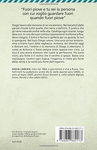 Diego lavora alla revisione di un vocabolario. Nei barattoli delle parole chiude tutto quello che riesce a definire. È pratica che gli viene naturale anche nella vita. Cataloga ogni istante: luogo data ora. In uno dei suoi continui spostamenti tra Roma e Pisa, dove insegna, il treno si ferma in galleria per un guasto, le luci si spengono. Nel buio Diego sviene. Una voce arriva lontanissima a tirarlo fuori dalla vaghezza: Antonia. Leri diventa oggi e domani ieri, l'ordine e la memoria di Diego si allentano. E come se Antonia ci fosse sempre stata eppore non c'era. La loro è una storia d'amore che vuole la perfezione. Più sono vicini, più forte è il rischio che il cerchio si spezzi. Basta una menzogna. Contro ogni logica, Il'inganno si rivela più forte della verità e la verità più forte dell'inganno.