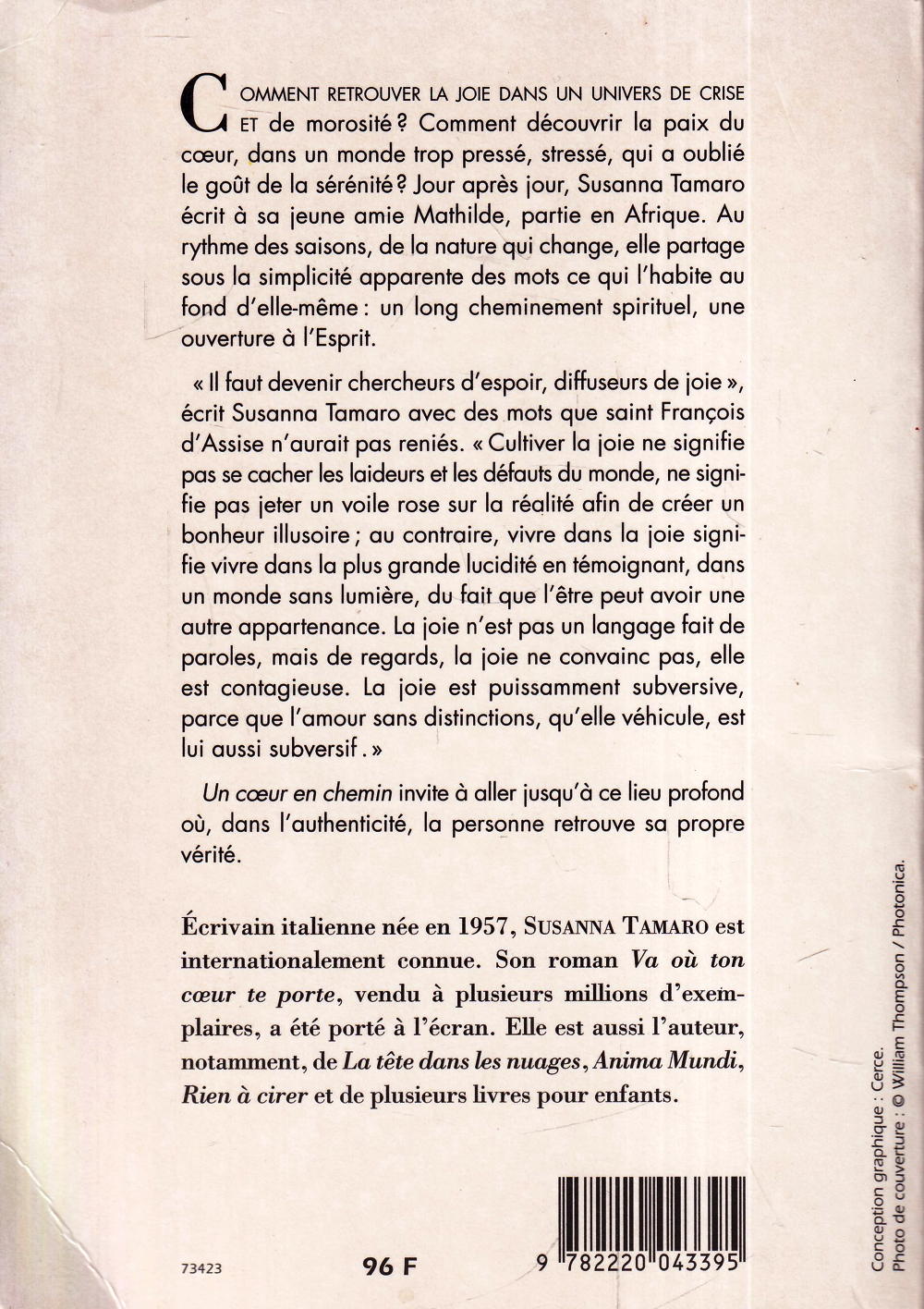 Comment retrouver la joie dans un univers de crise et de morosité ? Comment découvrir la paix du coeur, dans un monde trop pressé, stressé, qui a oublié le goût de la sérénité ? Jour après jour, Susanna Tamaro écrit à sa jeune amie Mathilde, partie en Afrique. Au rythme des saisons, de la nature qui change, elle partage sous la simplicité apparente des mots ce qui l'habite au fond d'elle-même: un long cheminement spirituel, une ouverture à l'Esprit. Il faut devenir chercheurs d'espoir, diffuseurs de joie , écrit Susanna Tamaro avec des mots que saint François d'Assise n'aurait pas reniés. Cultiver la joie ne signifie pas se cacher les laideurs et les défauts du monde, ne signi¬fie pas jeter un voile rose sur la réalité afin de créer un bonheur illusoire; au contraire, vivre dans la joie signi¬fie vivre dans la plus grande lucidité en témoignant, dans un monde sans lumière, du fait que l'être peut avoir une autre appartenance. La joie n'est pas un langage fait de paroles, mais de regards, la joie ne convainc pas, elle est contagieuse. La joie est puissamment subversive, parce que l'amour sans distinctions, qu'elle véhicule, est lui aussi subversif. Un coeur en chemin invite à aller jusqu'à ce lieu profond où, dans l'authenticité, la personne retrouve sa propre vérité. Quatrième de couverture